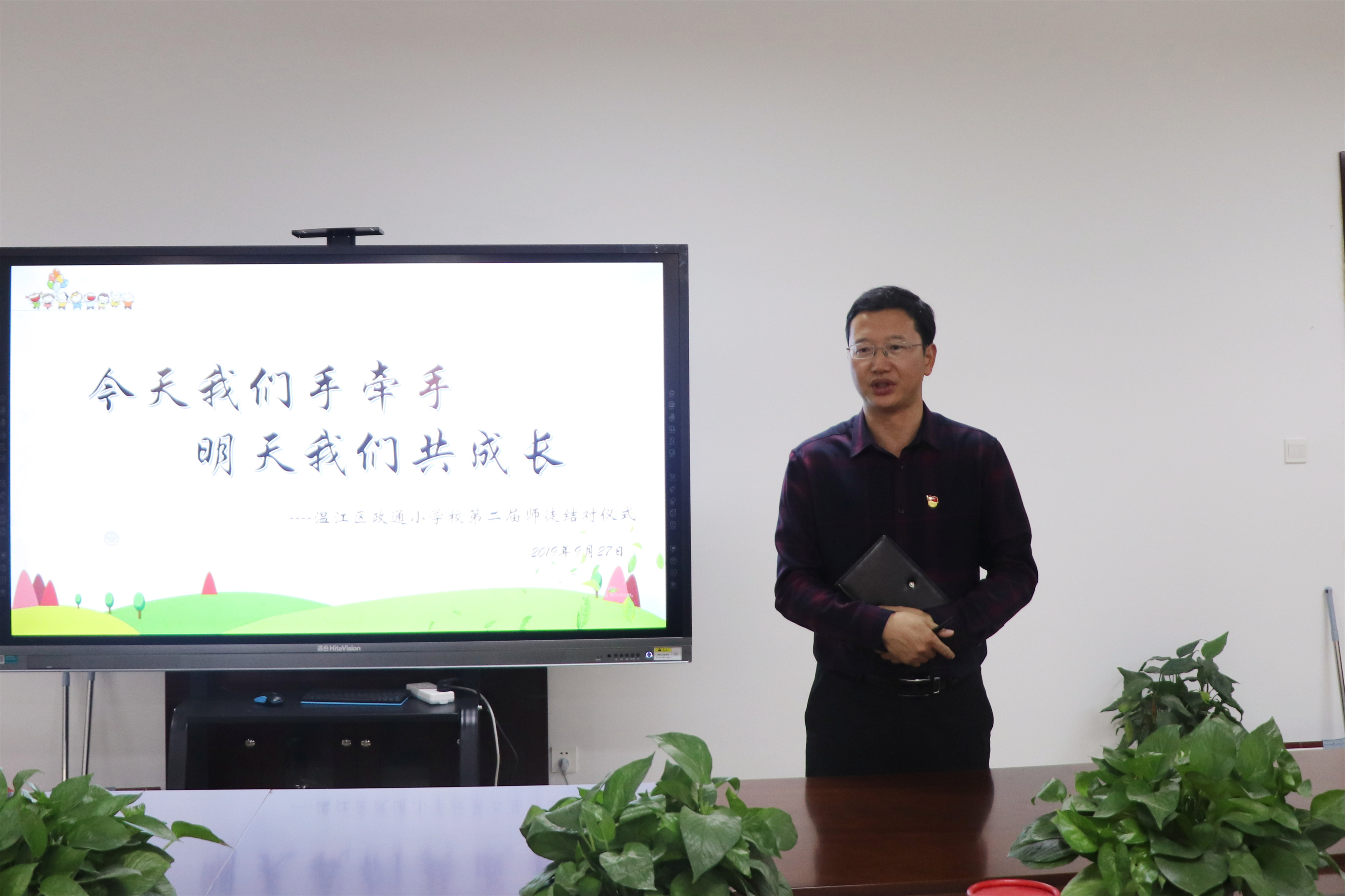 为了加快学校青年教师的成长步伐,发挥骨干教师引领、辐射、示范作用,真正做到“以老带新、以优促新”,学校以青蓝工程为依托,以师徒结对为基本形式,于2019年9月27日下午在会议室开展了隆重而充满温情的第二届师徒结对仪式。