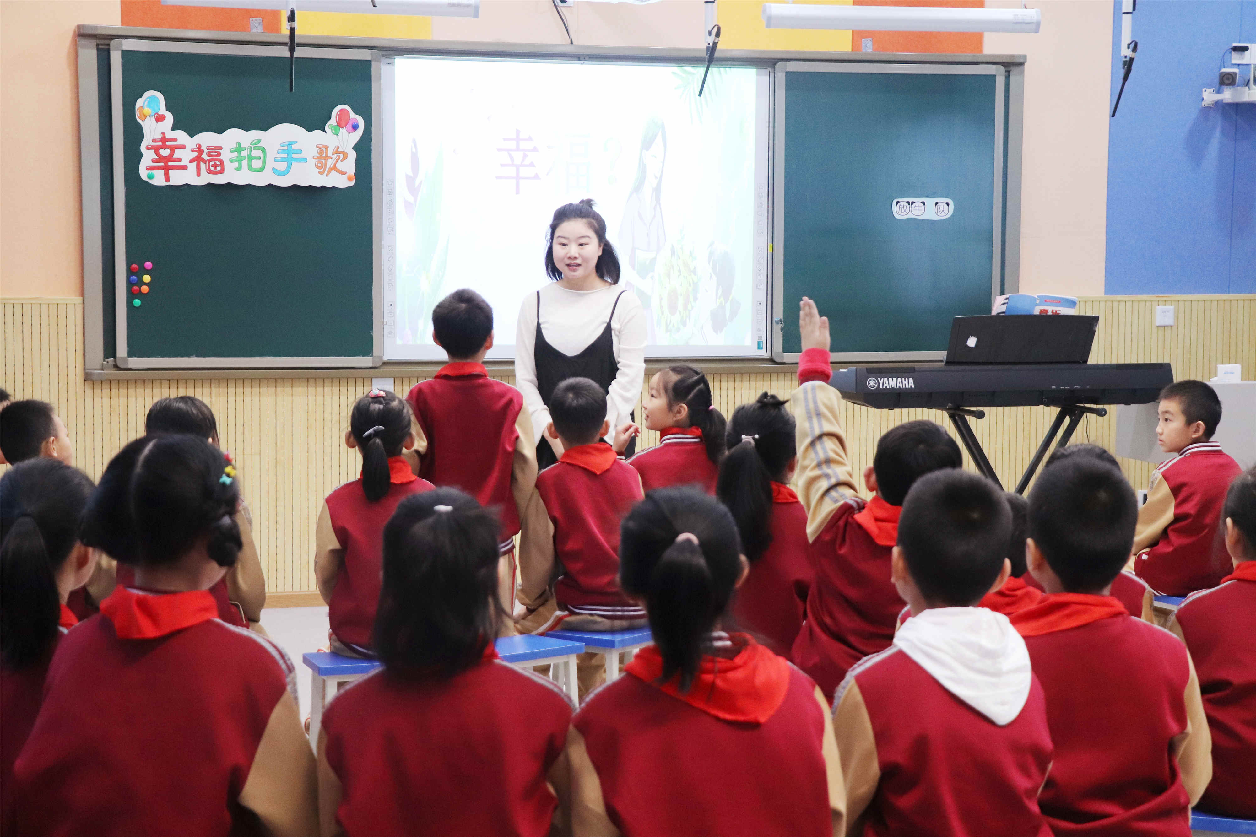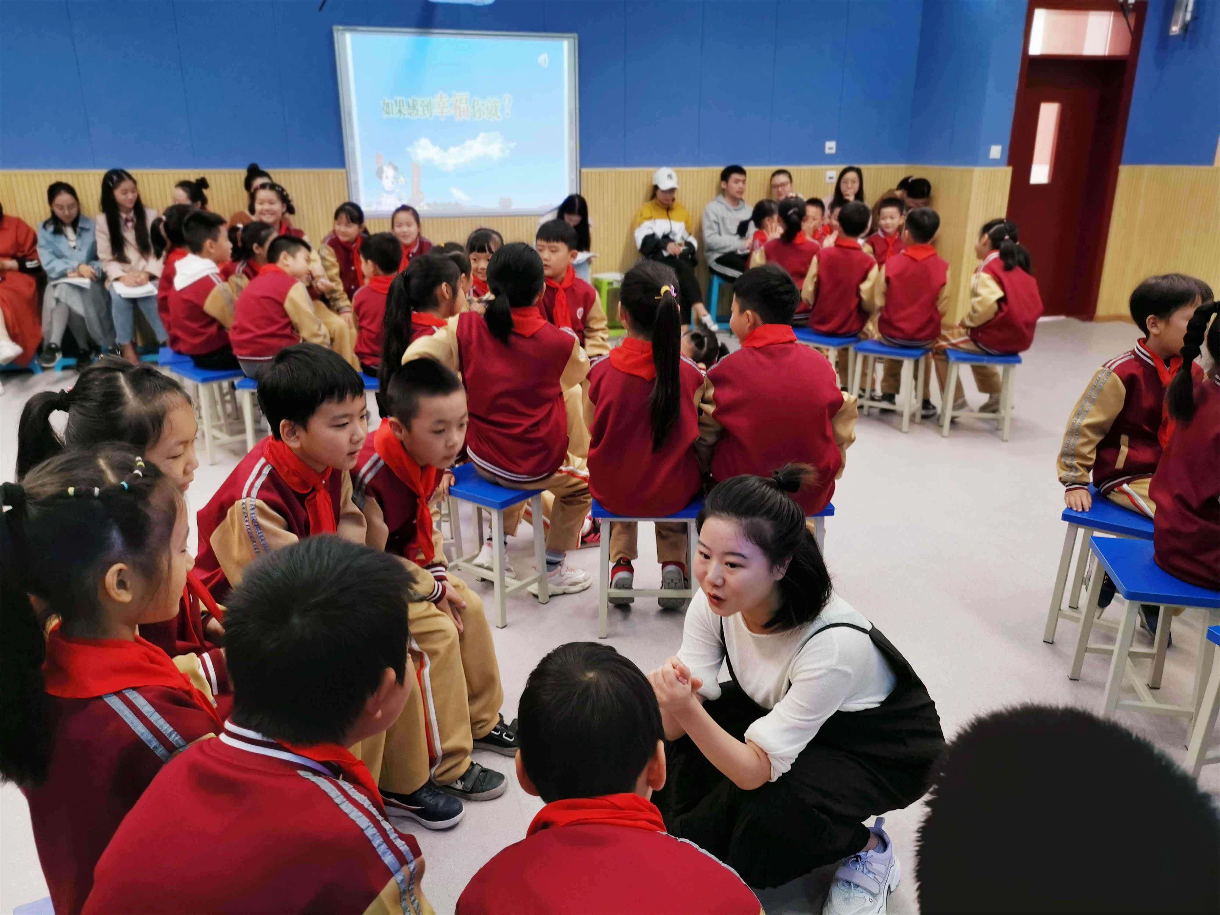 第二堂课上,金马学校李雪萍老师为大家带来了《幸福拍手歌》。随着轻松活泼的音乐响起,李老师与学生一起随音乐律动起来,让孩子们紧张的情绪一下子消失,融入到了我们的课堂氛围中来。你觉得幸福是什么?孩子们童真的思想里有千万种答案,看似好笑,却是孩子们最单纯的表达。艺术的真正意义不就是在于使人幸福吗?李老师用她亲切的语气,丰富的肢体语言,把她与孩子们的距离一步步拉近。整个课堂丰富多彩,曼妙活泼。从孩子们的歌声和笑脸中就能感受到这堂课的意义。