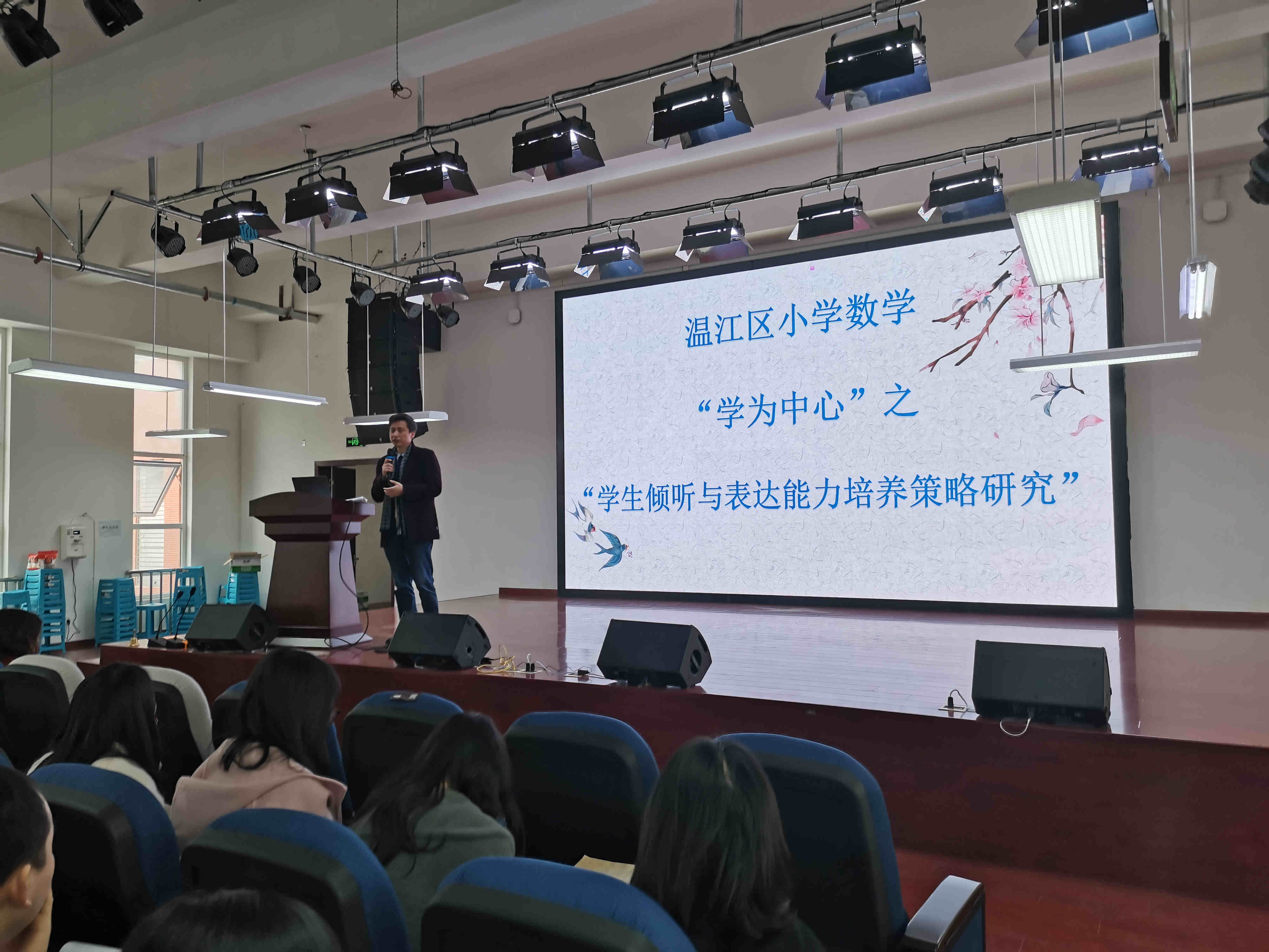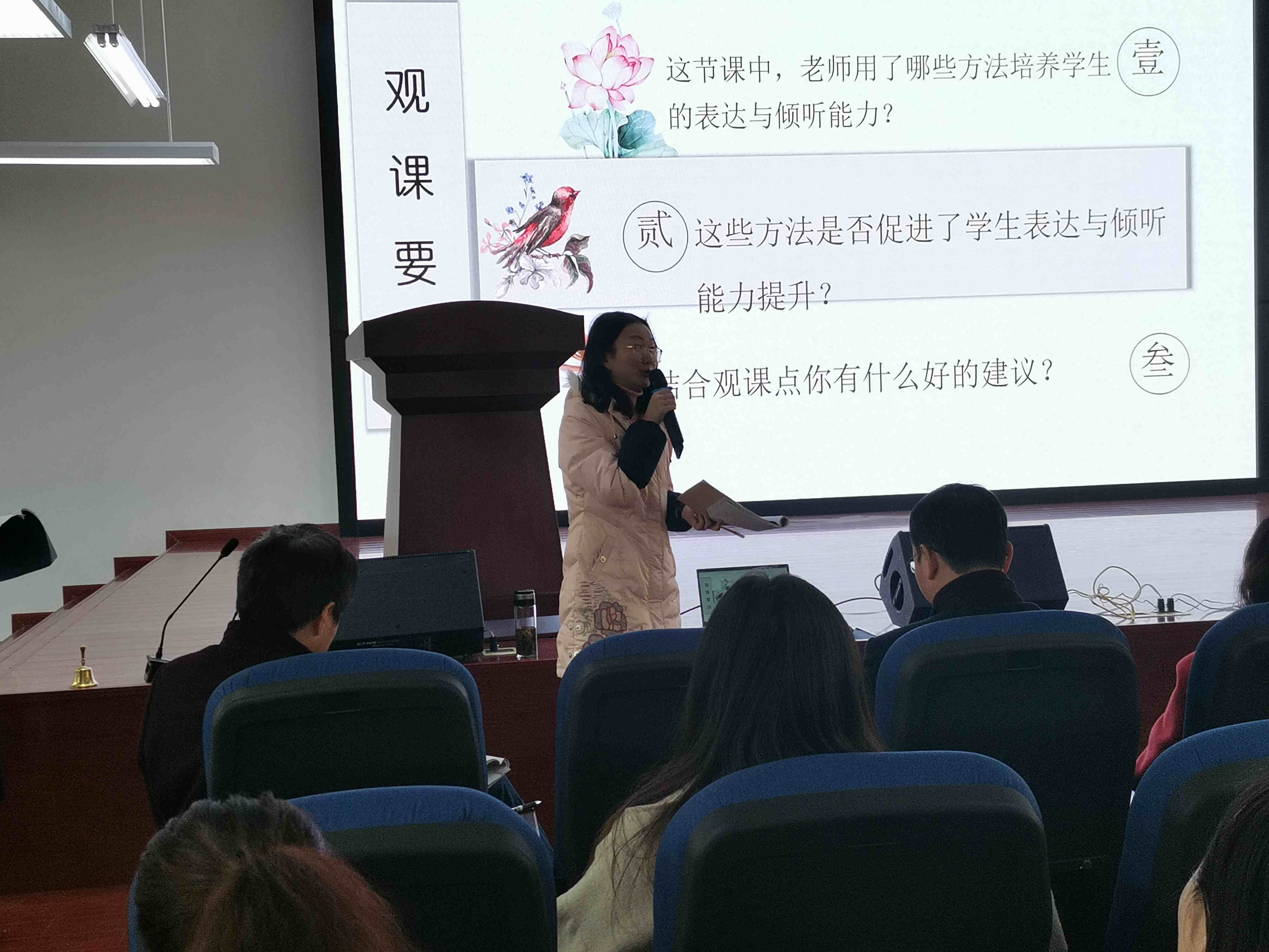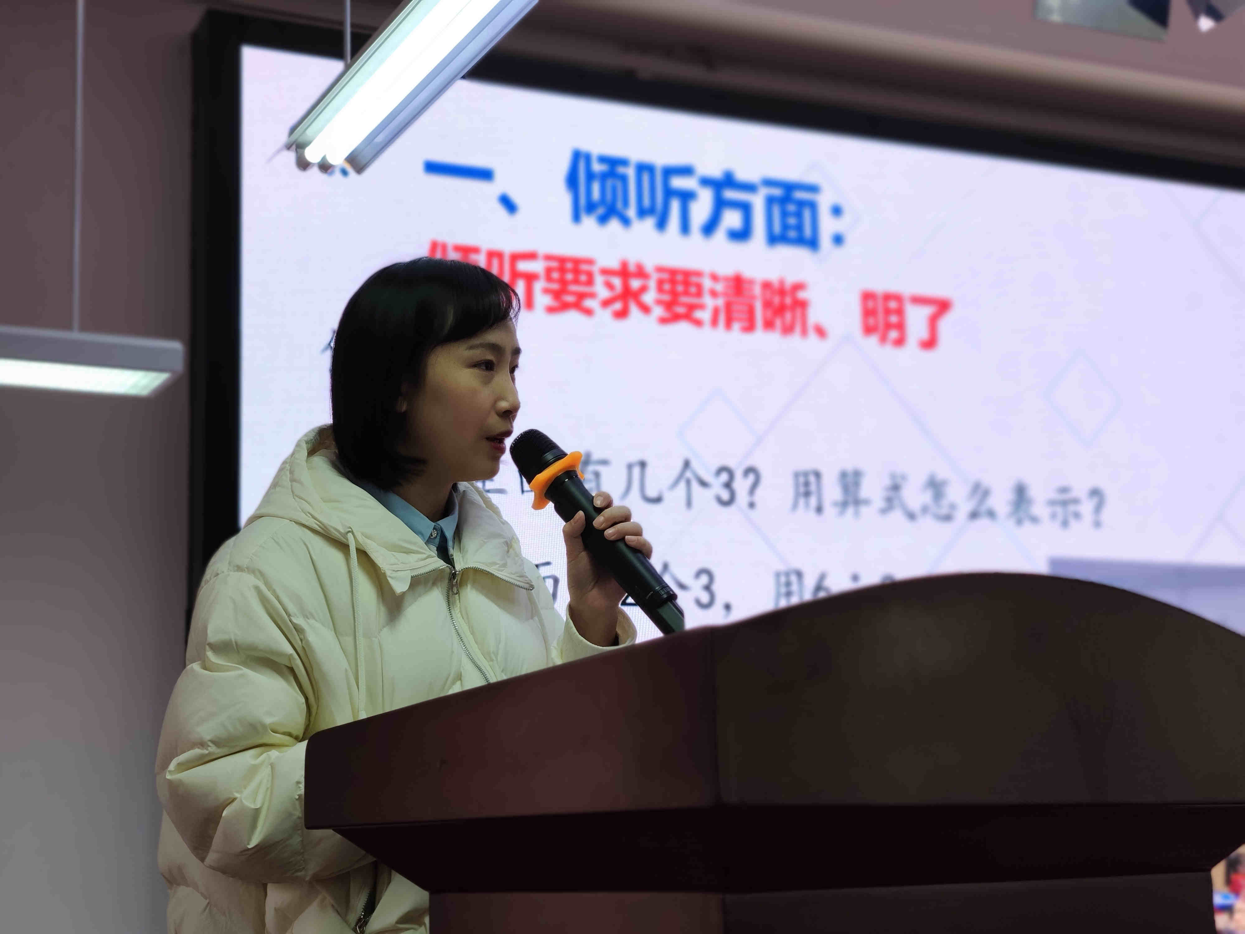 随后,成都实验外国语小学韦文清老师以《如何培养低段学生良好的“听,说”习惯》为题,做了专题讲座。讲座中,她梳理了培养学生听说习惯的几大策略:让学生的“心”安静下来——积淀数学语言、让学生的“心”活跃起来——锻炼语言表达能力,还要注重听说的细节——仪表、仪态、状态等。