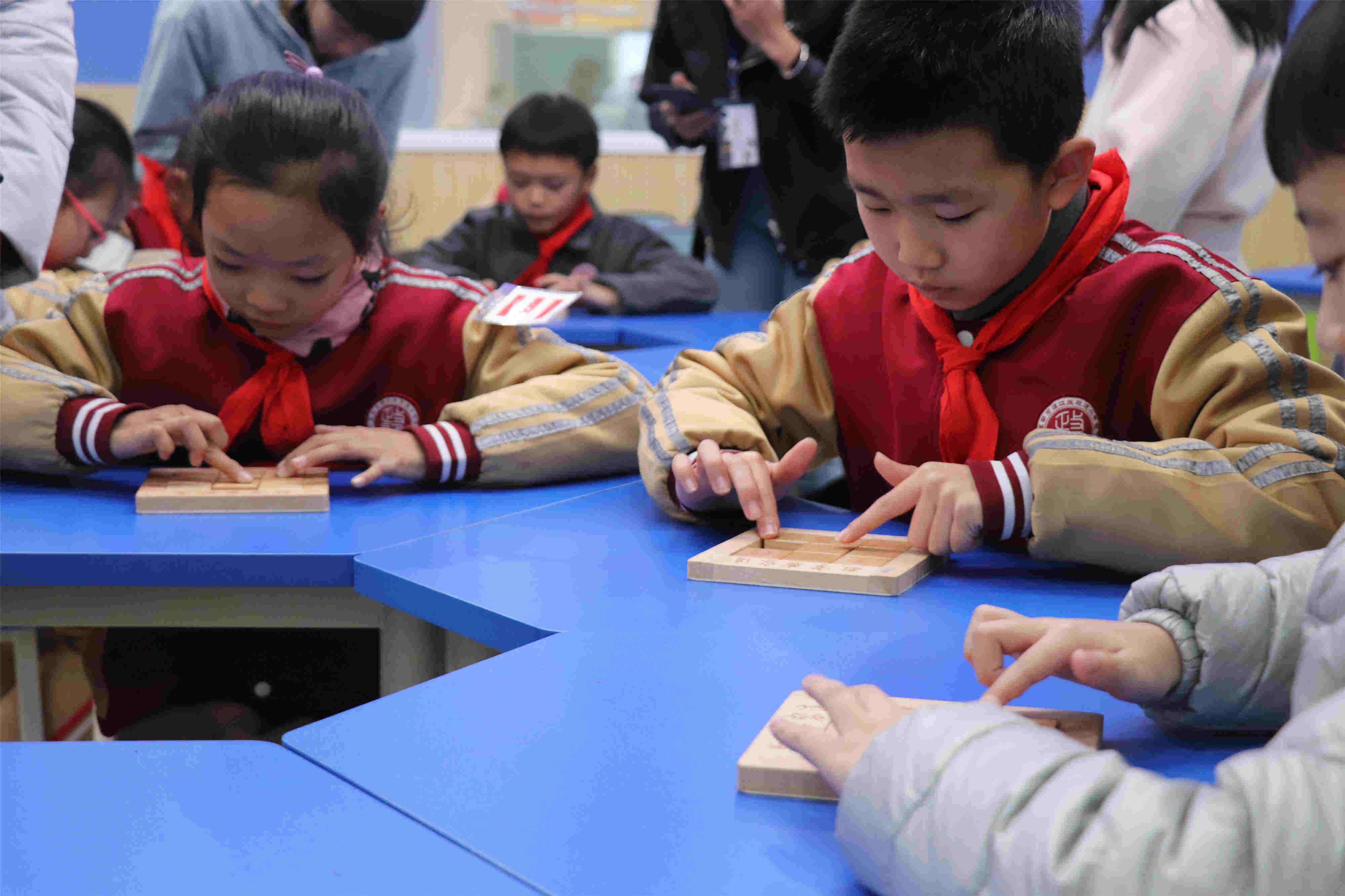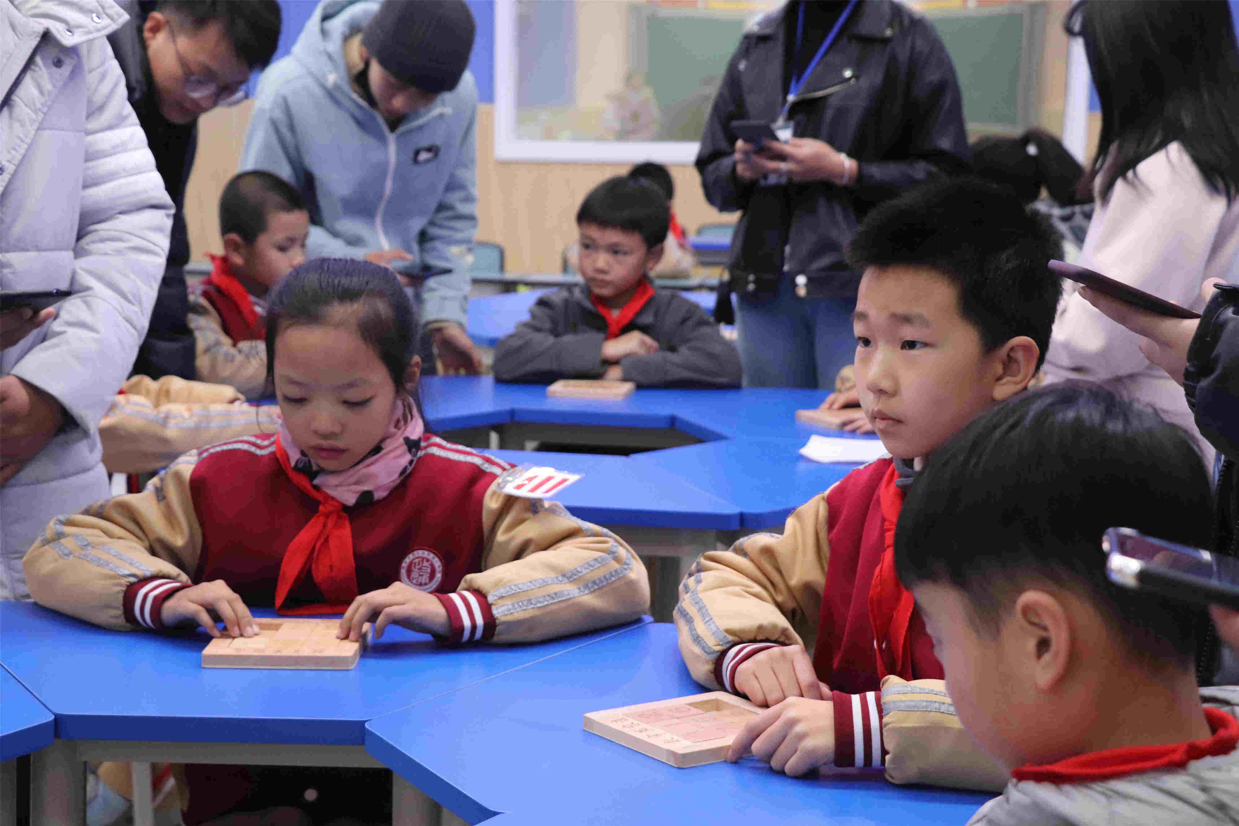 随着刘老师一声令下“比赛开始”,选手们聚精会神注视着手中的华容道,手指在板上不停地飞舞!