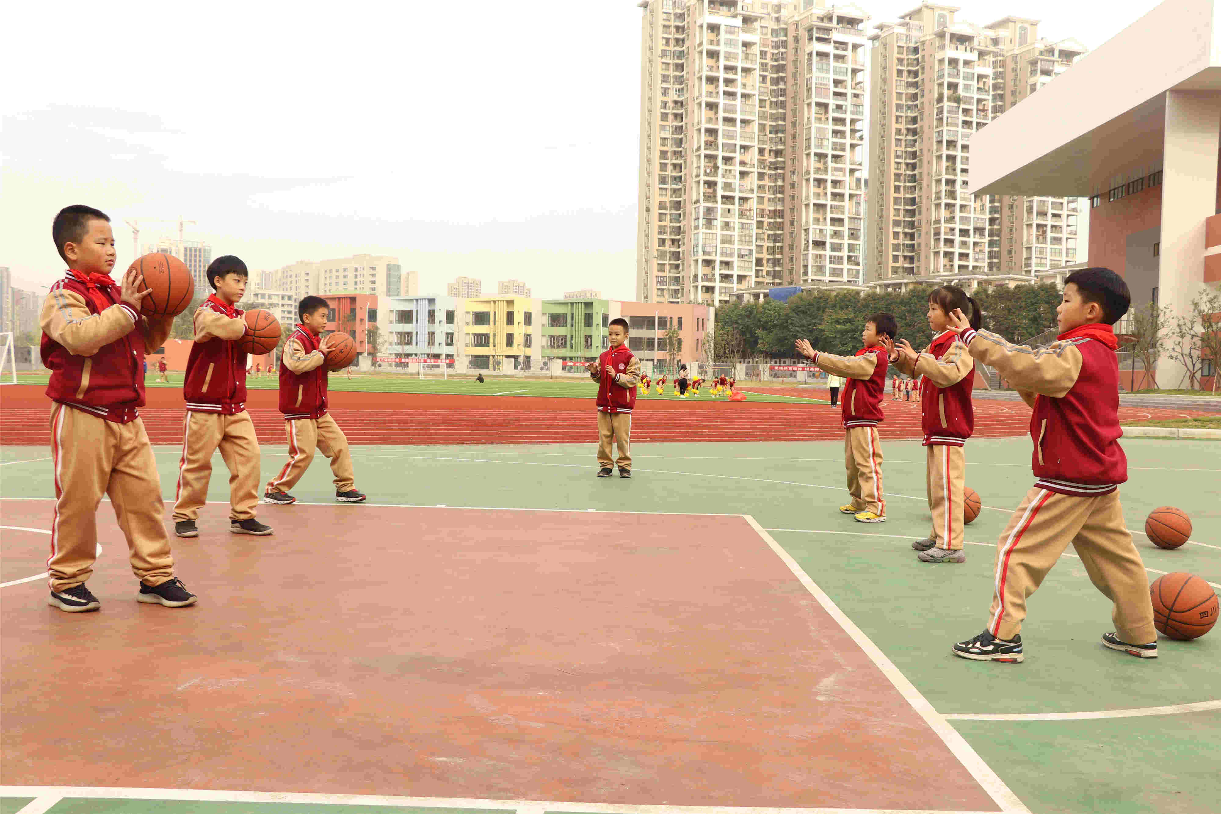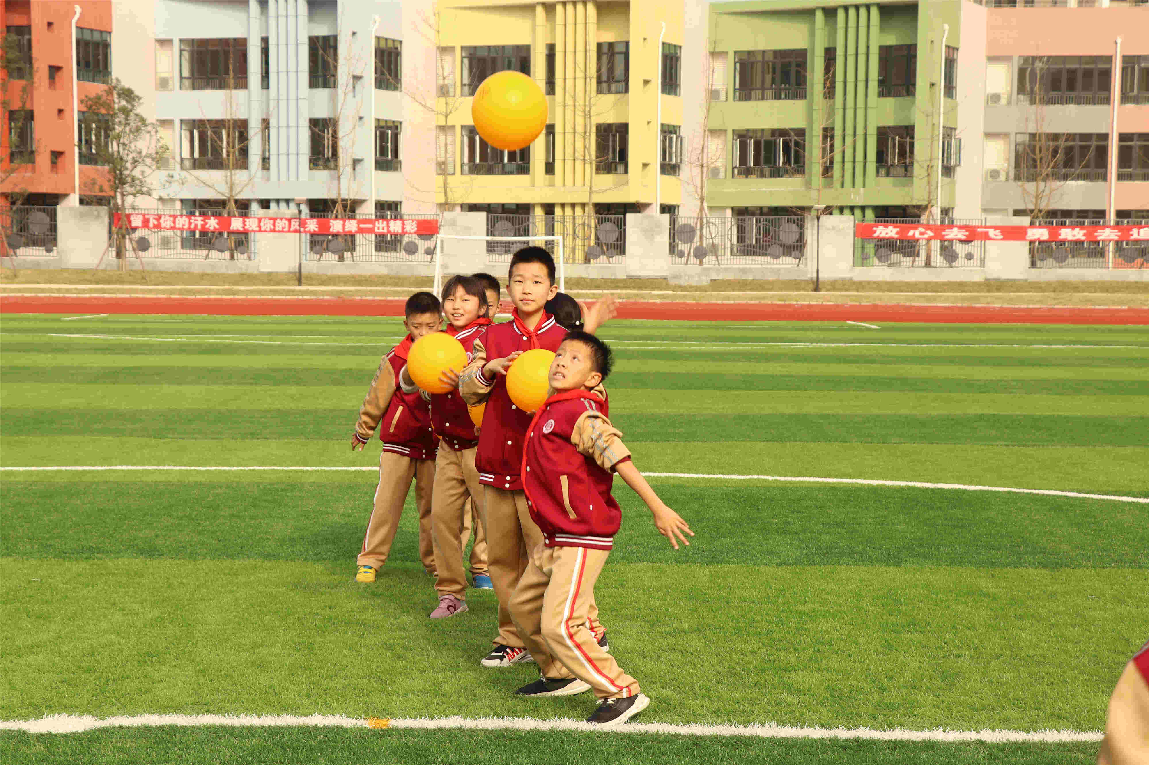 快瞧,宽阔的田径场上开始忙碌起来,有踢着球的、有拿着排球、有拿着花球的.....你知道他们在干什么吗?