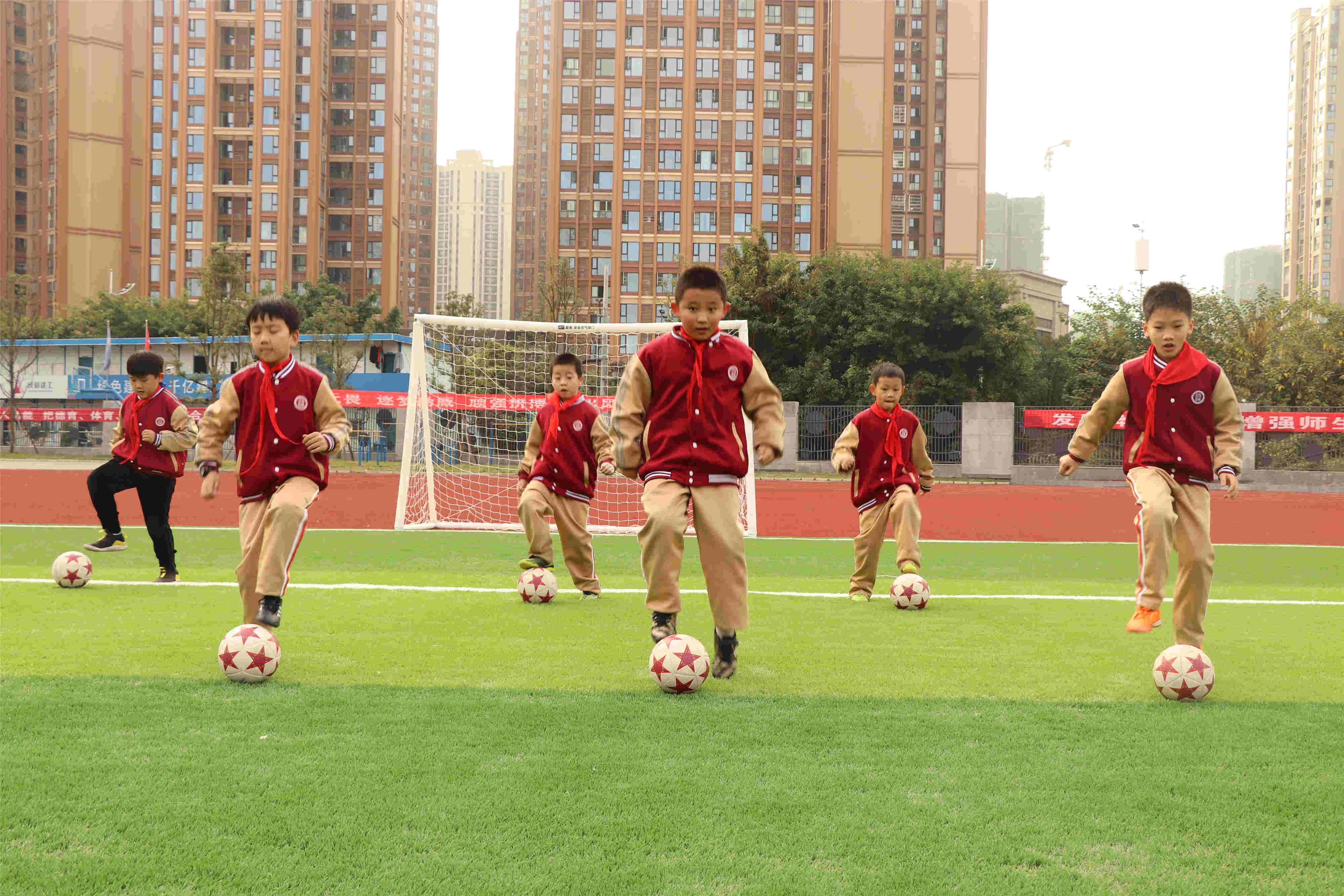 看,远处绿茵场上奔跑的小小少年们,那是政通小学足球社团在活动呢!足球运动让阳光和汗水伴随孩子们一起健康快乐成长,让孩子享受足球带来的乐趣!