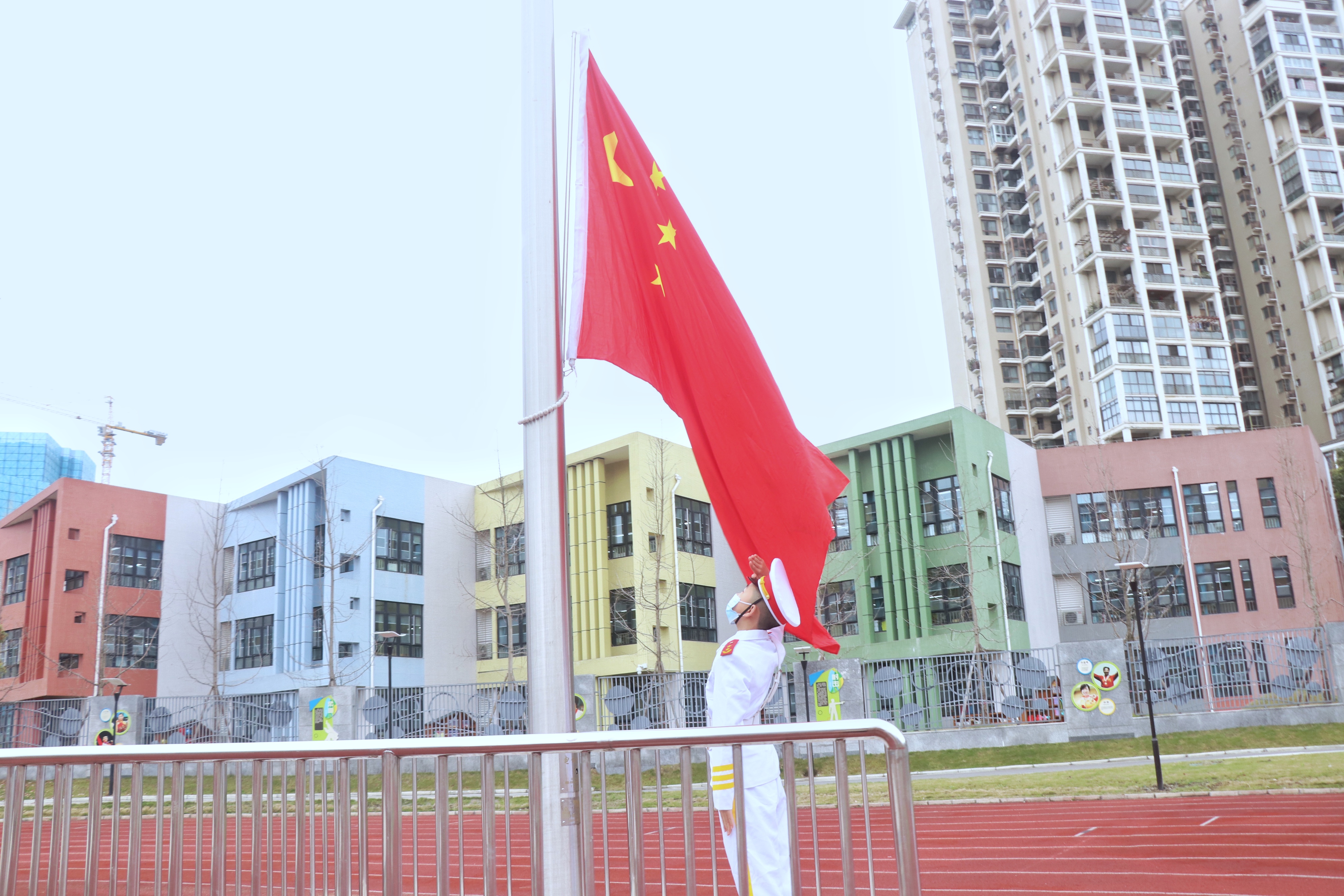 在激越昂扬的国歌声中,开学典礼正式拉开序幕。全校师生面向冉冉升起的五星红旗,肃然站立,用嘹亮的国歌声表达对祖国的感恩之心。