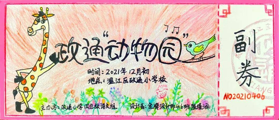 为了让政通动物园拥有属于自己的、独一无二的门票。四年级的小朋友们全体参与了“门票设计大赛”,小小设计师们积极思考,发挥想象,把智慧凝聚在画笔上,设计出了一张张充满童趣的门票。通过班级初选,年级复选,4年级6班金牌设计师陈瑾涵和4年级8班银牌设计师张珂馨的作品脱颖而出,并以此为模板,印制出1000张动物园门票。四年级的小朋友们组成“送票天团”,把这份冬日里的惊喜送给老师,送给同学,送给斑斓的童年。