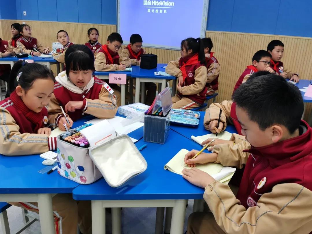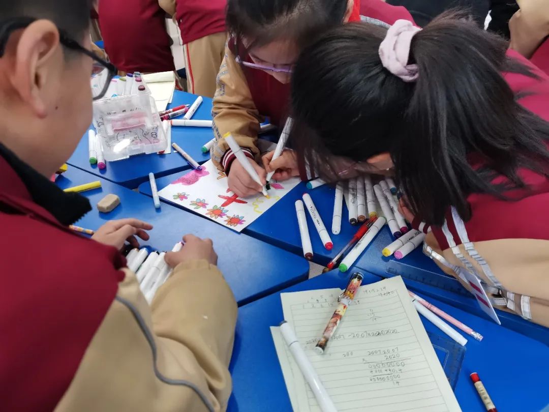 通过第一轮紧张角逐,比分已经有了一定的差距,接下来欢迎大家来到第二关:“我是小小设计师” ——用学过的轴对称、旋转、平移等知识设计一幅精美的海报。在仅仅10 分钟的时间里,每个战队分工明确,有设计图案的,有涂色的,有想队名口号的,还有准备介绍的!每个小战队不仅完成得很圆满,更让我们惊喜的是他们自信满满的介绍!在学中玩,在玩中学,快来跟着孩子们设计的海报,感受一下数学的对称美、特殊美吧!