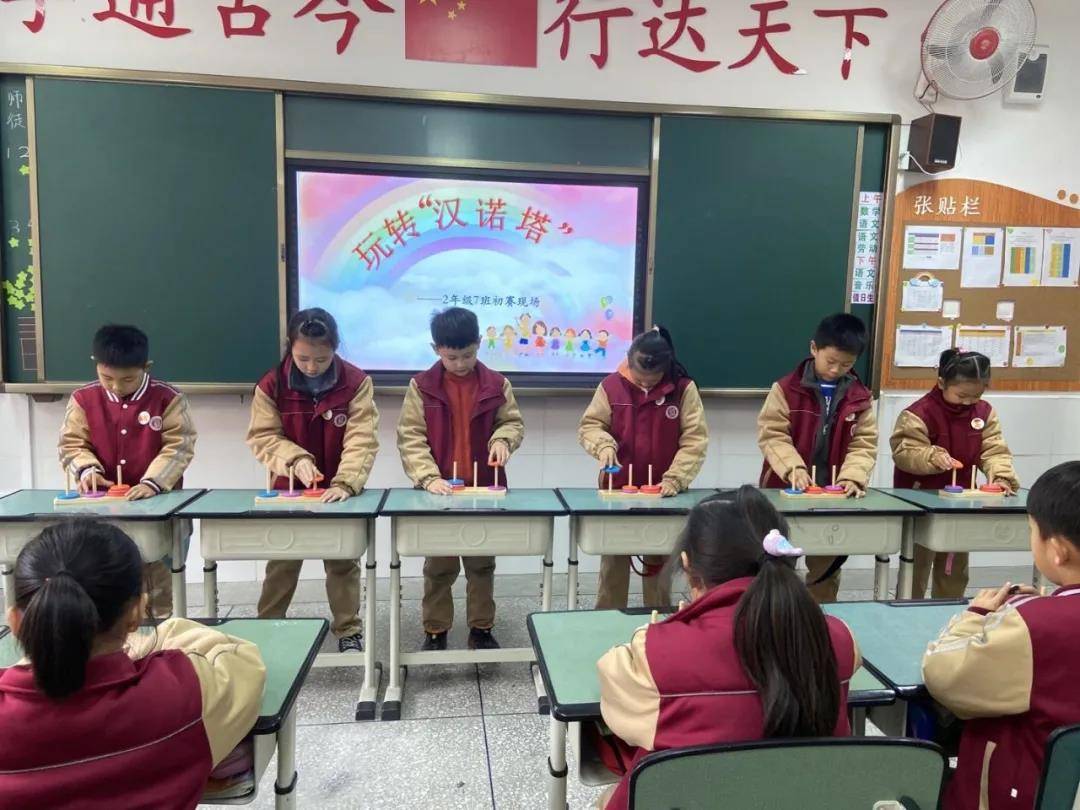 比赛前期,二年级数学组教师在课堂上带领孩子们走进印度神话,认识汉诺塔,并介绍了汉诺塔游戏的比赛规则,通过反复练习,孩子们能从中发现规律,找出汉诺塔的“奥秘”。经过一周的练习,班级初赛拉开帷幕,比赛中6人一组,看!比赛的同学全神贯注,手指翻飞,围观的孩子鸦雀无声,目不转睛,比赛现场气氛紧张激烈,经过层层选拔,最终每班选出用时最短的3名选手代表班级参加年级决赛。