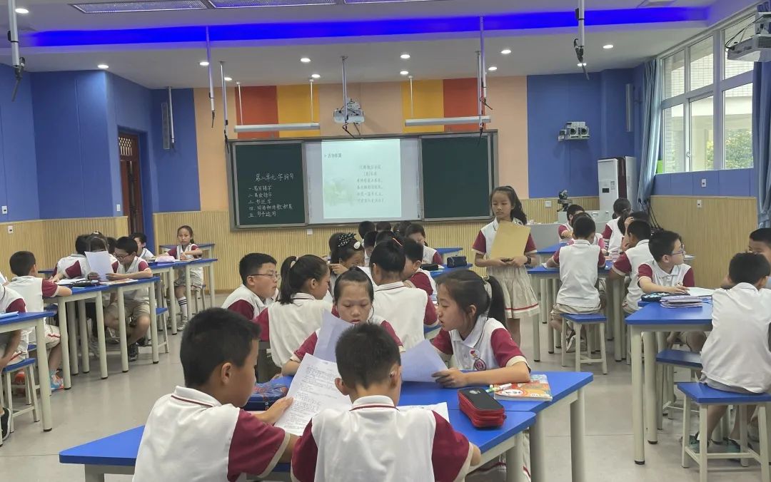 本次活动,呈现了两趟精彩的课例展示。首先,陈辉老师和四年级十班的同学们为大家展示《期末复习—第二单元字词句》。瞧,陈辉老师退到学生中间扮演学生,小老师正在组织课堂进行复习。从易写错字、易读错字、形近字到词语和诗歌积累、句子运用,小老师信心十足的带领同学们高质量的完成了这五个活动,陈辉老师在每个环节里设计的结构化支架有效提高了同学们的练说能力。