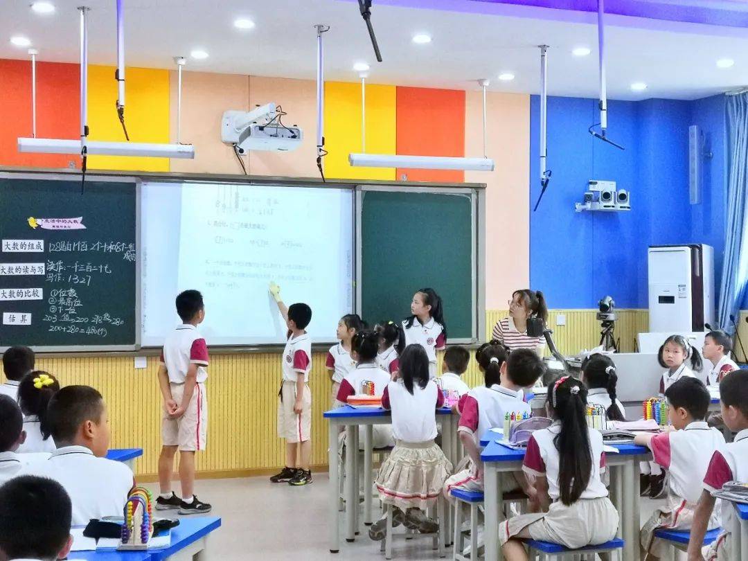 第二节课是由刘颖老师和二年级七班的同学们展示的《生活中的大数(整理与复习)》。展练一班的小老师们用稚嫩的声音和可爱的肢体语言带领同学们复习了数的组成、数的读作和写作、数的比大小以及数的估算,小老师们的讲解有条不紊、自信大方,刘颖老师设计的结构化支架帮助同学们总结了本单元的主要学习内容。