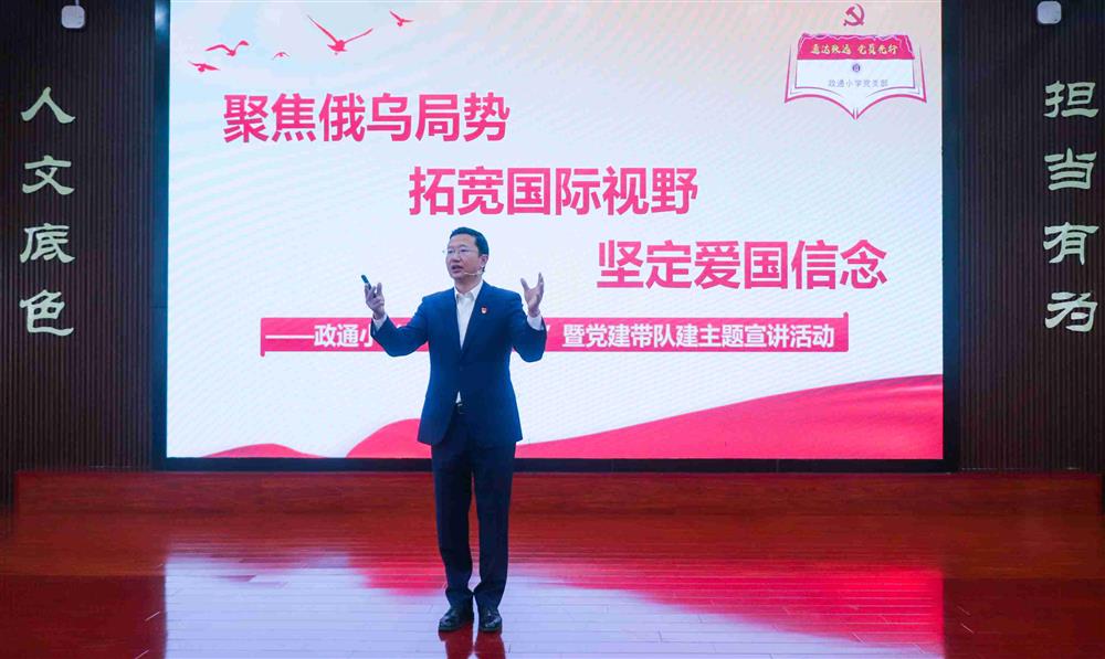 春和景明,万象更新。为进一步树立少先队员的正确价值观,激发学生的爱国热情,全力培养社会主义建设者和接班人,3月9日下午,政通小学党支部开展了“书记讲党课”暨党建带队建主题宣讲活动。支部书记黄金强同志以《聚焦俄乌局势 拓宽国际视野  坚定爱国信念》为题,就当今俄罗斯乌克兰战争相关时政热点,为全体党员教师及五年级学生展开了一场别开生面的讲座。