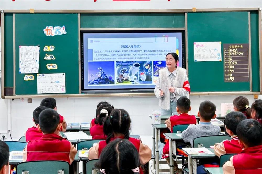 “小虾老师好!”一年级四班孩子们激动地挥舞着小手,和这位特别的美术老师——肖雅涵同学的妈妈打着招呼。课堂上,小虾老师用《机器人总动员》主人公瓦力导入教学,有效调动了孩子们的兴趣,再通过一系列机器人身体部位的特征和线条展示,给了孩子们点石成金般的灵感。在小虾老师的鼓励和引导下,孩子们在课堂上积极探索,发挥想象力和创造力,画出了一个个可爱而又别致的机器人。