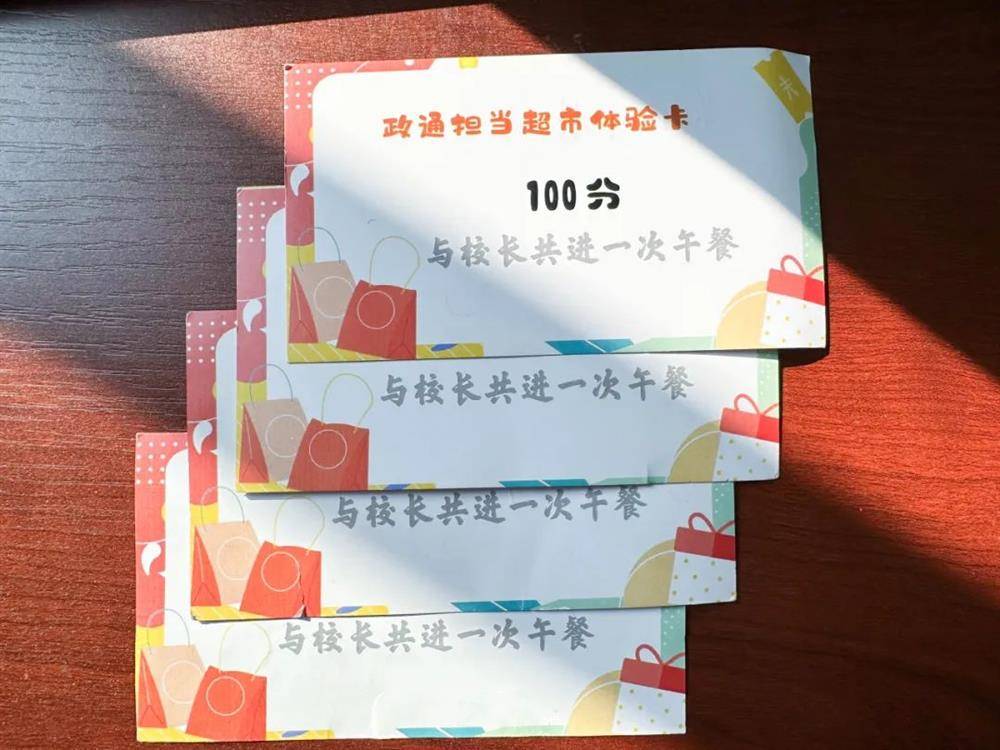 活动伊始,六年级九班刘熙瑞、五年级二班郭芷涵、六年级四班肖淋、二年级六班金思含四位同学欢欣鼓舞地递上了一份“校长有约”的邀请函。在政通校园里,每个同学都有机会通过自己的努力获得特色评价小卡片,并将积攒的小卡片兑换为政通币,就可在定期开展的担当小集市上兑换奖励。这份特殊的邀请函,便是同学们德智体美劳全面发展的物化成果。